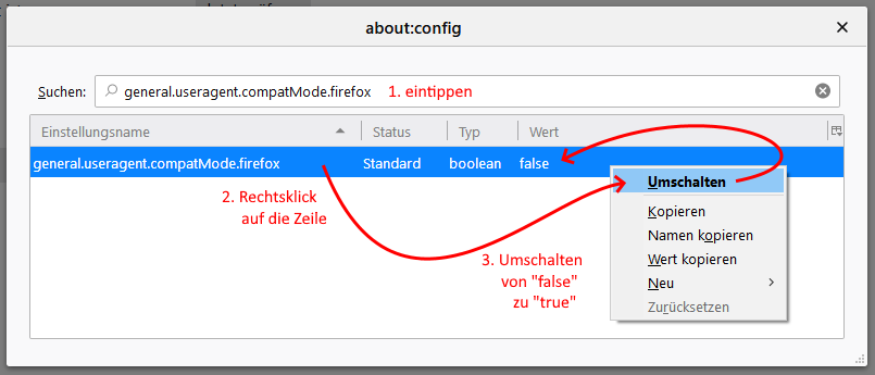 Für die Übergangszeit kann man das Problem kurzfristig beheben, indem man in Thunderbird den Konfig-Editor benutzt und dort die versteckte Einstellung general.useragent.compatMode.firefox auf true umschaltet.