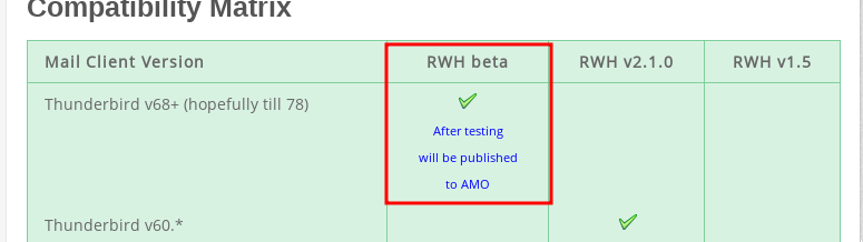 Da es sich bei der Version für Thunderbird 68.n.n ausdrücklich um eine Beta-Version (also Test-Version) handelt, ist es aus meiner Sicht richtig, dass der Entwickler dieser Erweiterung diese aktuell noch nicht auf der Thunderbird-Seite veröffentlicht hat. An seiner Stelle würde ich es genauso machen. Und auf dessen Webseite heißt es (rot umrandet):
