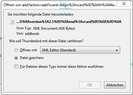 Macht es aber nicht. Thunderbird fragt mich hier mit welchem Programm ich das öffnen möchte. Lade ich die V-Card runter erhalte ich ein seltsame .part-Datei mit dem Namen "tE+PiqBM.xml.part"