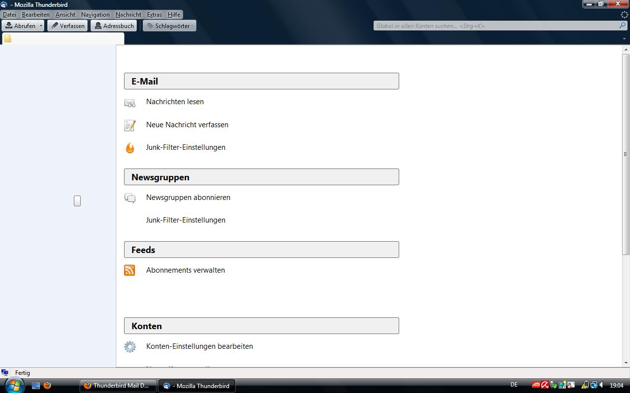 Beim Start von Thunderbird wird mir in der linken Spalte weder der Posteingang noch sonstige Informationen angezeigt! Alle versuche etwas zu finden schlugen fehl, auch eine Neu-Installation von Thunderbird brachte nicht den gewünschten Erfolg!