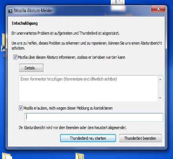 seit gestern kommt bei jedem Versuch Thunderbird zu starten die Meldung vom Mozilla Absturz Melder das Thunderbird abgestürzt ist. Ich habe auch probiert TB im Abgesicherten Modus zu starten, da kommt aber dieselbe Meldung und nichts geht. Nächster Versuch war TB zu deinstallieren und die neueste Version 15.0 zu installieren (hab die Installation auch bei ausgeschalteter Firewall vorgenommen) aber es kommt immer noch die gleiche Fehlermeldung. Weis vielleicht jemand was ich noch Probieren kann um das Problem zu lösen?