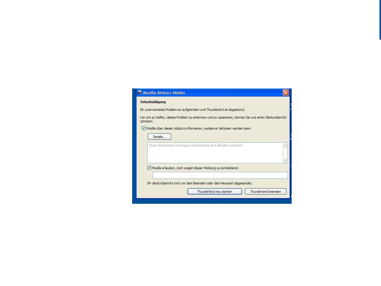 Nun erhalten wir bei doppelt klick auf Thunderbird folgende Meldung, bei klick auf Details kann man sich nichts anschauen