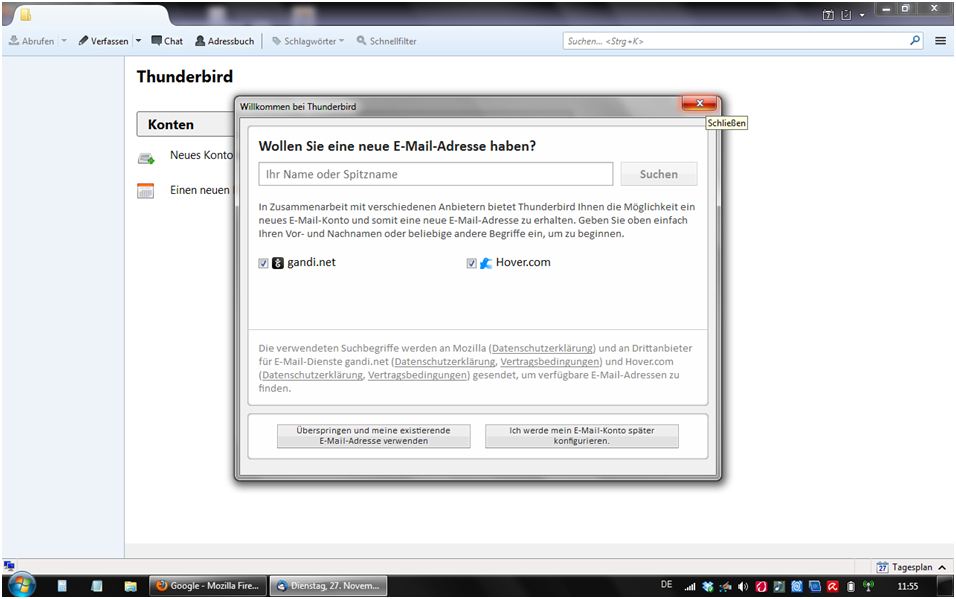 Meine gesamte Thunderbird-Oberfläche ist leer, und das einzige was das Programm mir anbietet ist "Wollen Sie eine neue E-Mail-Adresse haben?"