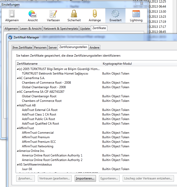 Nun ist es so, dass ich mich beim besten Willen nicht daran erinnern kann, AOL, TÜRKTRUST oder AddTrust oder oder oder mein Vertrauen ausgesprochen zu haben. Auch Frage ich mich, was das mit meinem Thunderbird zu tun hat. Warum speichere ich auf meinem PC Zertifikatanbieter, mit denen ich nichts zu tun haben möchte? Oder ist das lediglich eine Liste, mit der Thunderbird standardmäßig "ausgeliefert" wird und alles ist bestens in Ordnung?