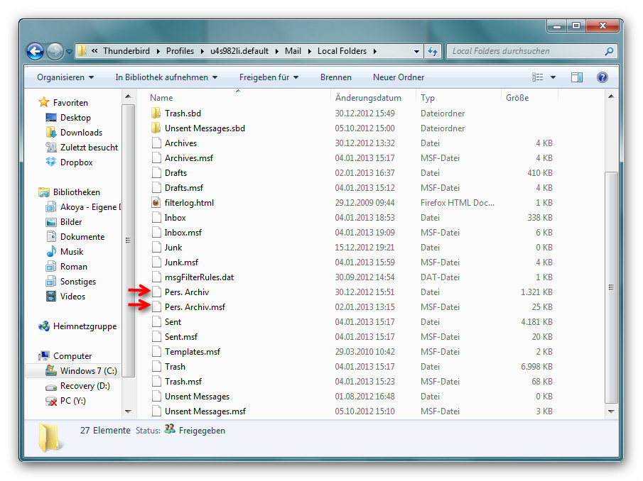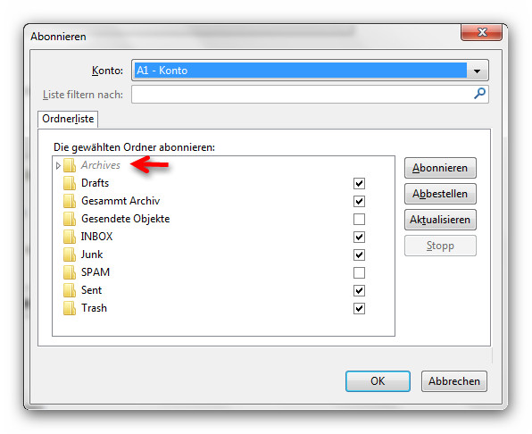 Bisher verwendete ich ein POP3 Konto. Habe aber jetzt auf IMAP gewechselt. Im POP3 Konto legte ich mir selber einen Ordner mit dem Namen "Pers. Archiv" an. Darin habe ich Mails abgelegt, die ich mir behalten möchte. Möchte nochmal darauf hinweisen, dass diese Mails nicht im Archiv Ordner liegen, der standardmäßig bereits in TB vorhanden ist ! Sondern im eigens erstellten Ordner.