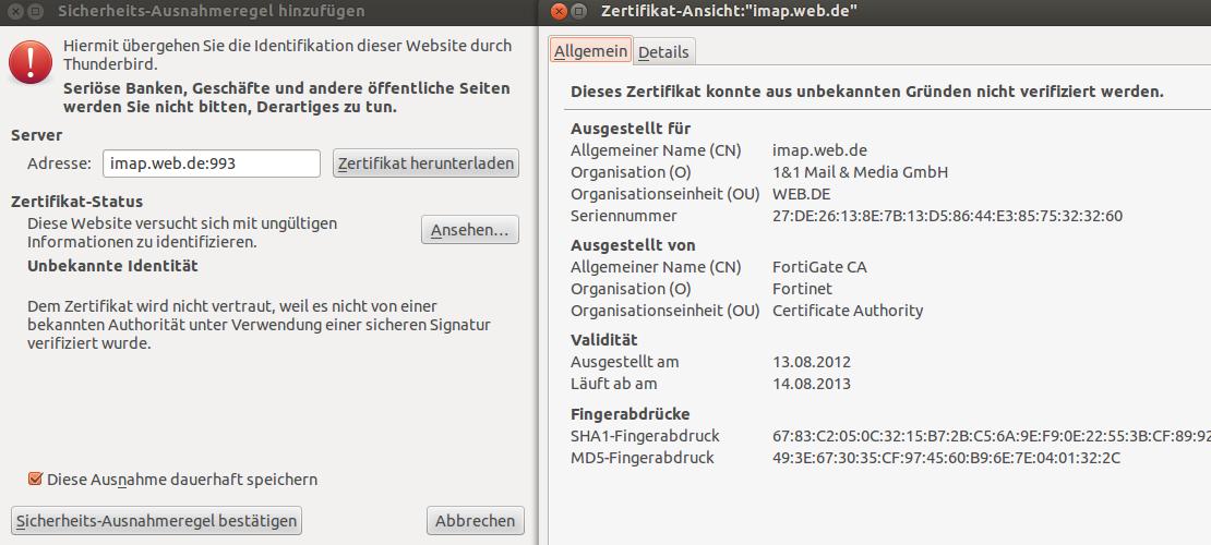Beim Anmelden am web.de Server spuckt TB einen Zertifikat-Fehler aus und möchte, dass ich eine Ausnahmeregelung treffe. Ohne dies zu tun, verbindet sich TB nicht mit dem Server von web.de. Die web-Oberfläche von web.de funktioniert einwandfrei. Der Fehler kommt seit 4 Tagen nahezu immer beim Starten von TB.