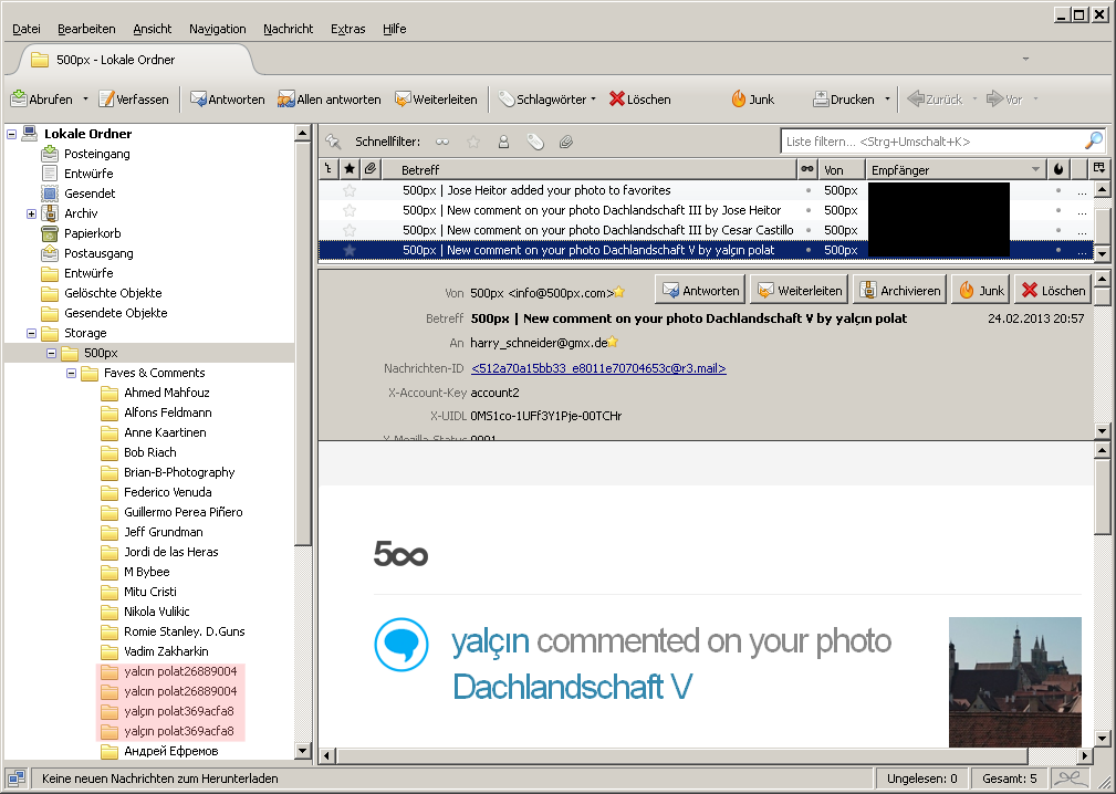 Ich wollte dann die Mails einfach im Hauptordner 500px belassen und habe den Unterordner "yalcin polat" gelöscht, zur Sicherheit auch noch direkt danach im Papierkorb.