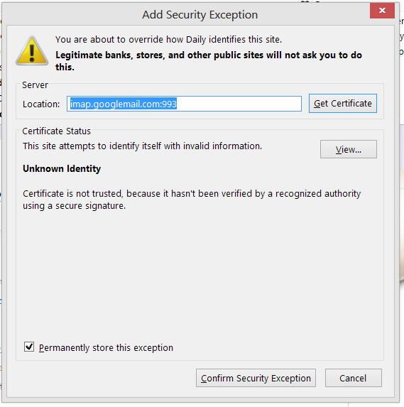 Ich erhalte bei Daily aber die Meldung, dass sowohl bei gmx (POP) als auch gmail (IMAP) die Identität nicht festgestellt werden könne - ich solle eine Ausnahmeregelung einrichten. Gleichzeitig werde ich aber gewarnt, dass seriöse Server dies nicht tun würden (Screenshot ist angehängt).