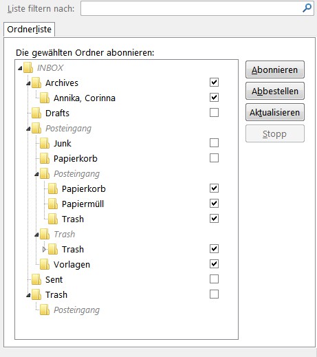 • Auch wenn jetzt alles "richtig" aussehen müsste, gehst du nach Datei >> Abonnieren. Hier kannst du auf dem Server vorhandene Ordner abonnieren (= auf dem Client anzeigen) oder eben nicht.