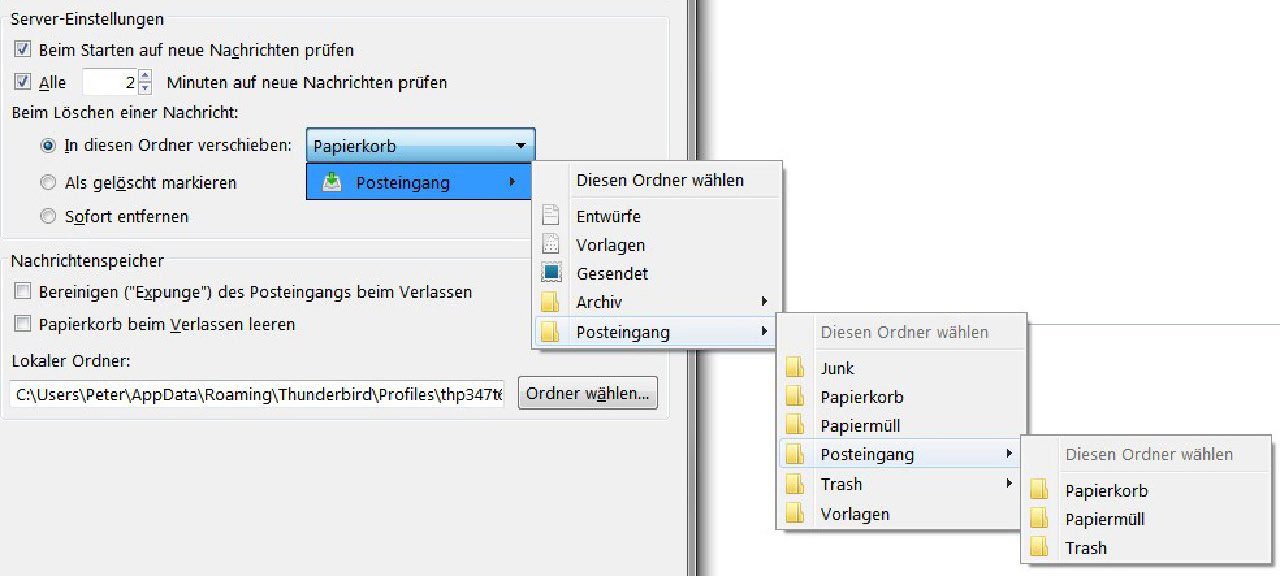 Das Problem mit den Ordnern "Trash" und "Papierkorb" resultiert aus unterschiedlicher Schreibweise bei verschiedenen Mailclients und Mailservern. Wenn dann gar noch ein Smartphone dazu kommt, ist das Durcheinander meistens perfekt.