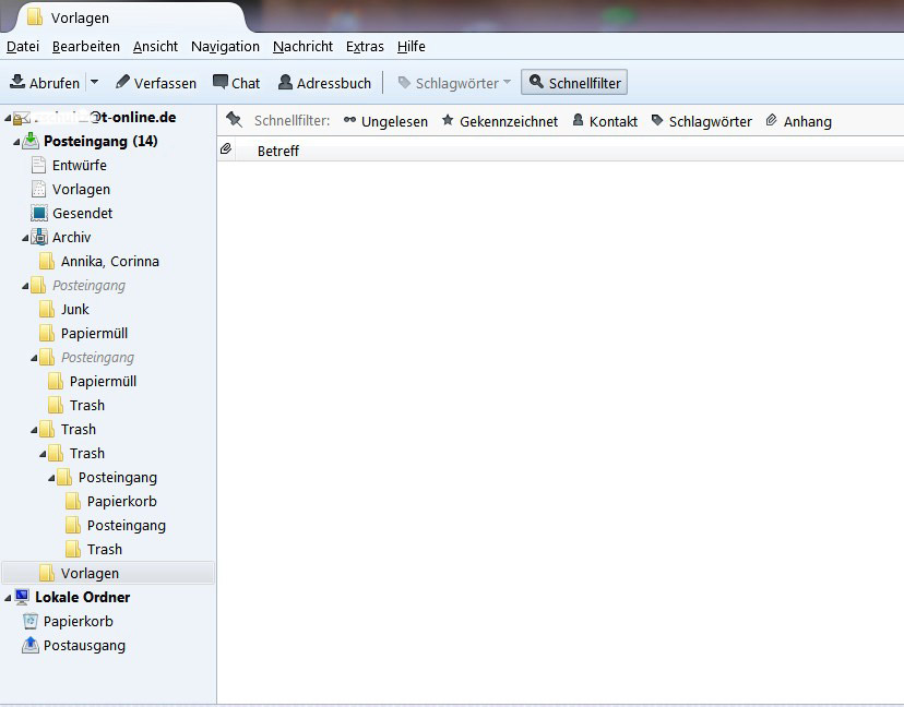 • Per Webmail <grusel, aber hier hilfreich> die tatsächlichen Zustände auf dem Server untersuchen. Dort, also an der Quelle, evtl. notwendige Veränderungen wie Löschen doppelter Ordner usw. vornehmen. Auf dem Server muss Ordnung herrschen! Also auf dem Server evtl. von dir dort (per IMAP-Client!) vorgenommene Veränderungen rückgängig machen.