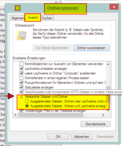und du kannst unter Ansicht bei "Versteckte Dateien und Ordner" den Punkt wie im Bild auf anzeigen setzen. -