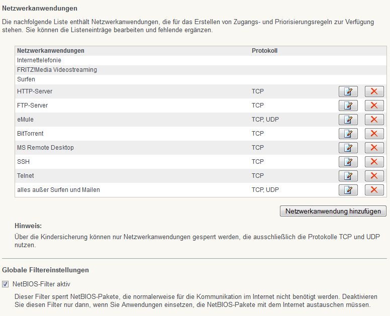 In der FRITZ!Box sind bereits einige Netzwerkanwendungen angelegt. Diese können Sie bei Bedarf über die Schaltfläche (Bearbeiten) anpassen.