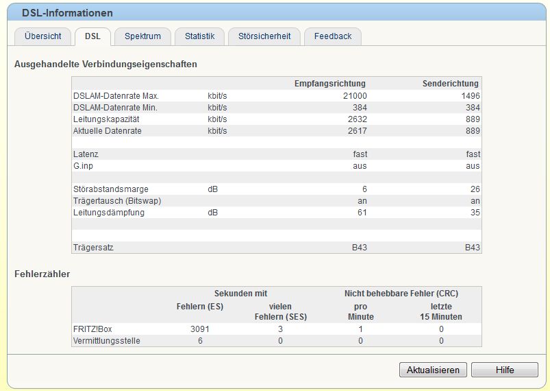 In den DSL-Informationen fällt mir auf, dass Du am Hauptverteiler eine rechnerisch mögliche Bandbreite im Downstream von 21kBit/s hast, die Leitungskapazität aber nur ein Zehntel beträgt. War das schon immer so, d.h liegt es an den letzten Metern der Leitung, oder ist das erst mit der neuen Fritzbox so?
