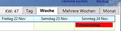 Jeden Montag erscheint bestimmungsgemäß ein Eintrag, welcher mir die jeweilige Kalenderwoche anzeigt. An manchen Montagen als erster Eintrag, mitunter auch mittendrin unter mehreren Einträgen. Manchmal sogar ganz am Ende.