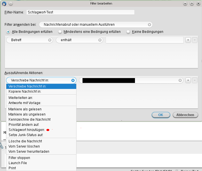 Dann erstellst Du den entsprechenden Filter mit Namen Schlagwort-Test, der im Betreff nach "Apfel" sucht und diesem das von Dir definierte Schlagwort "Apfel" zuweist (im Bild: mit dem "roten" Punkt gekennzeichnet).