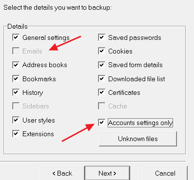 Wenn es so wäre, ja, ist es aber nicht. Denn beim Anhaken von "Account Settings only" wird von 15 (!) Kästchen nur das für Emails entfernt und das steht auch noch ziemlich weit entfernt, dass man das aus den Augenwinkeln kaum erkennt und übersehen kann:Gruß