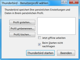 Allerdings kommt nur EMAIL neu einrichten und kein Profile Manger wie immer beschieben "Thunderbird -p" oder "Thunderbird -ProfileManger"