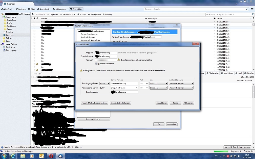Ich wollte jetzt von Outlook2010 zu Thunderbird(24.4.0) wechseln. Im gleichen Atemzug wollte ich auch meine E-Mail Postfächer von outlook.com und gmx zu mailbox.org transverieren. Jetzt tritt aber folgendes Problem auf: