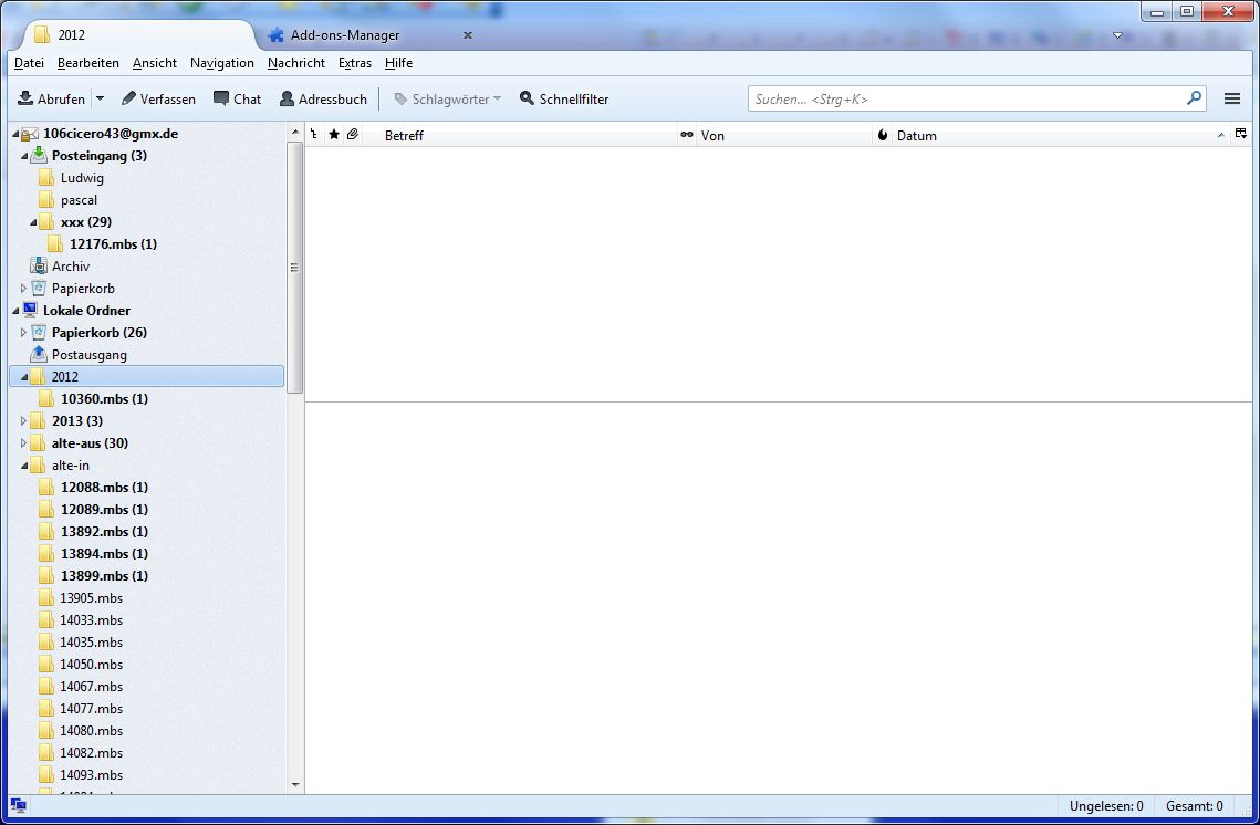 Ja, ich meine LOKALE ORDNER im Donnervogel. Ich habe eine einzelne MBOX-Datei aus 2012 eingelesen. Aber nach wie vor steht sie in der linke Fensterhälfte mit dem Ordnersymbol da. Wenn ich dieses in den INBOX-Ordner ziehe (mit Recthsklick und VERSCHIEBEN geht es gar nicht!??: Menupunkt ist ausgegraut!), dann kommt die Datei auch als ORDNER an und nicht die einzelne Mail.