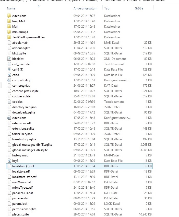 siehe=> Thunderbird-Menü Hilfe>Information zur Fehlerbehebung>Profilordner>Beinhaltenden Ordner anzeigen und Dateien im Profil kurz erklärt]