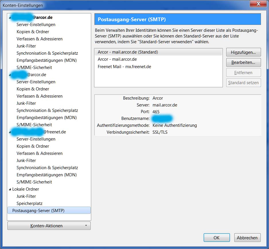 ich konnte problemlos E-Mails über Thunderbird verschicken. Seit einiger Zeit kann ich nur noch über Arcor.de E-Mails verschicken. Versenden kann ich Mails immer noch über Thunderbird.