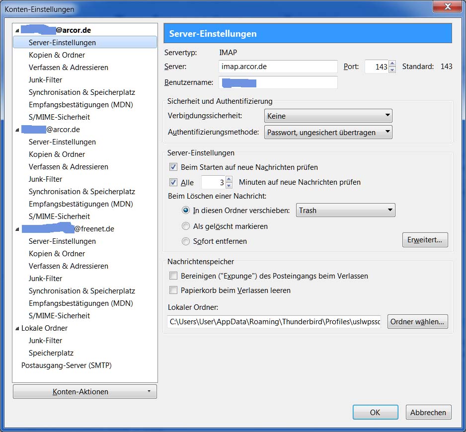 ich konnte problemlos E-Mails über Thunderbird verschicken. Seit einiger Zeit kann ich nur noch über Arcor.de E-Mails verschicken. Versenden kann ich Mails immer noch über Thunderbird.