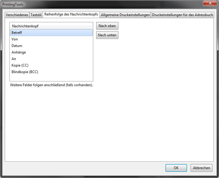 ich benutze folgendes AddOn PrintingTools 1.2.4.1 und möchte wissen wie man einzelne Einträge aus der Kopfzeile (Betreff, Von, Datum etc entfernen kann beim Drucken ???