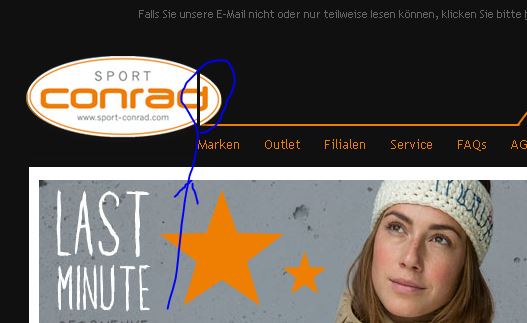 Beim Abruf von Emails werden besonders bei Shops oftmals verschiedenste Graphiken verwendet: dabei kommt es oft vor, dass diese an verschiedensten Stellen, kurz nachdem sie geladen sind (da sind sie kurz in Ordnung), dann an unterschiedlichen Stellen "gespalten" (d. h. getrennt werden - meistens horizontal oder vertikal) und die dann entstehenden Teilbilder etwas auseinandergeschoben werden (meist 2-3 mm): siehe Anhang und Spalt im Logo der Fa. Conrad.