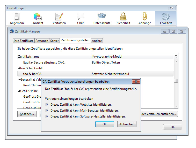 Die (eigene) CA habe ich aber hinzugefügt. Siehe auch Screenshots im Anhang.