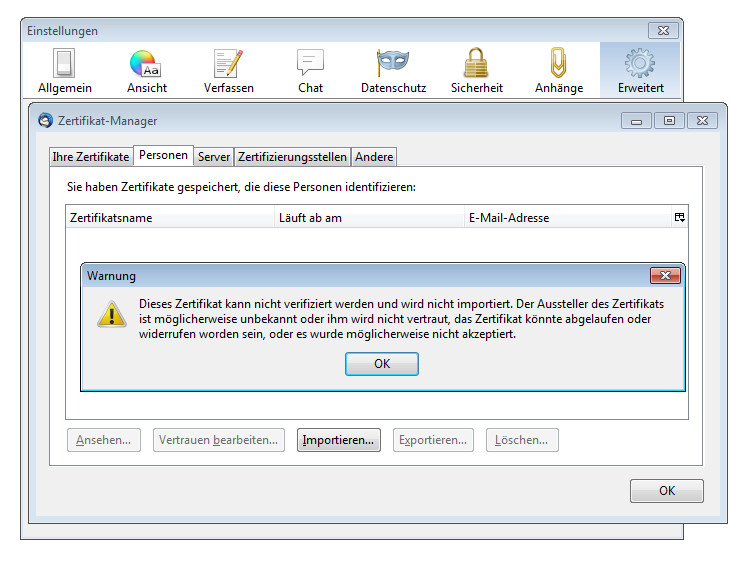 Dieses Zertifikat kann nicht verifiziert werden und wird nicht importiert. Der Aussteller des Zertifikats ist möglicherweise unbekannt oder ihm wird nicht vertraut, das Zertifikat könnte abgelaufen oder widerrufen worden sein, oder es wurde möglicherweise nicht akzeptiert.