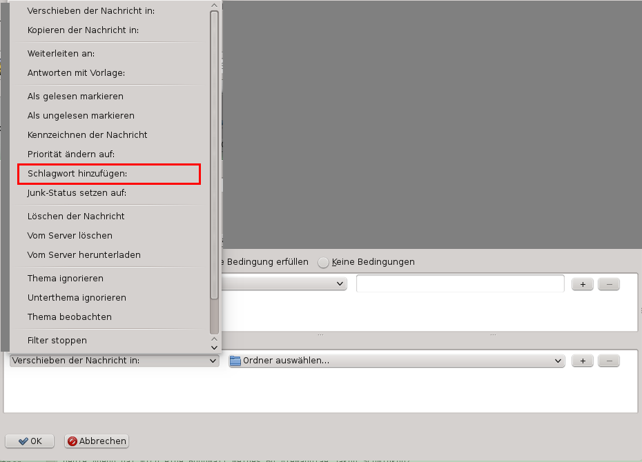 Wenn Du also im Bereich des Filters unter Auszuführende Aktionen "Schlagwort hinzufügen" wählst, dann wird Dir, wenn beim Senden Deiner Mail das automatische Filtern aktiviert ist, für diese Mail ein Schlagwort gesetzt.