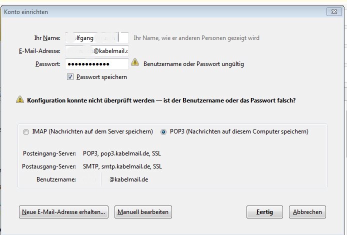 Betriebssystem Win 7, beim Hinzufügen eins E-Mail Kotos ( Kabelmail.de ) immer die gleiche Fehlermeldung: