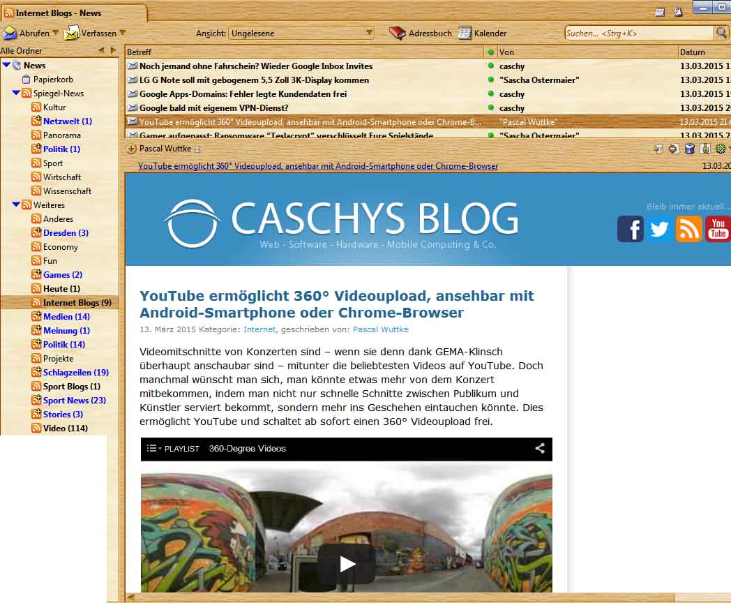 Feeds abonniert (SPON, Spox, Caschy, allesaussersport, Youtube-Channel und viele mehr, Beispiel: Last Week Tonight auf Youtube => http://gdata.youtube.com/feeds/base/use…youtube-profile), "Ansicht"-"Feed-Artikel"-"Website" und er lädt den jeweiligen Feedartikel innerhalb des TB-Nachrichtenfensters wie im Browser, inklusive Grafiken, Flash-Videos und anderer eingebetteter Medien.