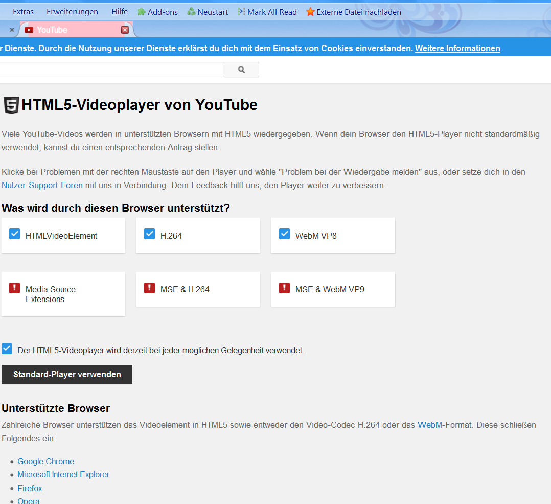 noch etwas: bei mir werden die youtube Videos in HTML-5 abgespielt. Mache mal einen Rechtsklick auf ein Video, dann siehst du es.