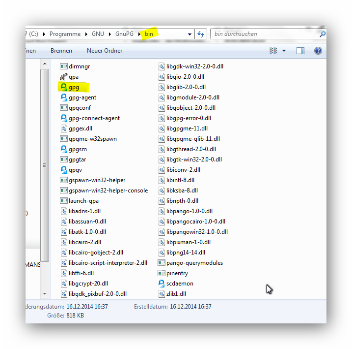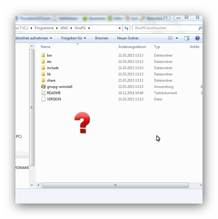 Ich verwende Thunderbird 31.5.0. Ich bekam die Meldung, dass ich wegen Enigmail, eine neuere Version von Gnupg installieren sollte. Bisher hatte ich die Version 1.4.16 installiert. Deshalb lud ich mir von Chip.de die Version 2.1.1 runter. Als erstes deinstallierte ich die alte Version und installierte die neueste. In Enigmail muss man ja den Pfad zur gnupg.exe Datei angeben. Nur ist diese Datei im Ordner nicht vorhanden (Screenshot). Bei der alten Version lag hier diese exe-Datei drinnen. Was soll ich jetzt machen ?