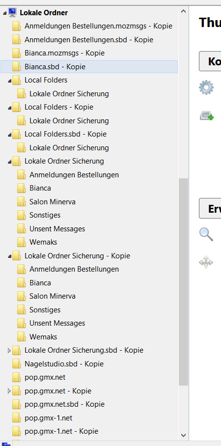 Der jetzige Stand ist, dass ich zwar die Ordner wieder im TB angezeigt bekomme, aber nicht die Unterordner und auch keine Mails, die eigentlich darin sein müssten und die ich im Explorer - nach öffnen mit Editor - sehr wohl sehen kann. Im TB ist allerdings ein ziemliches Chaos: Die Ordner sind mehrfach vorhanden, mal einfach, mal als Kopie, unter "Lokale Ordner" , im Ordner "Lokale Ordner Sicherung", im Ordner "Lokale Ordner Sicherung - Kopie" und im Ordner "Lokale Ordner Sicherung.sbd - Kopie" . 2 meiner alten Ordner haben dort die Dateiendung .mozmsgs, einige die Dateiendung .sbd und wieder andere ohne jegliche Dateiendung.
