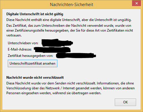 Also habe ich in Thunderbird die Zertifikate der Root CA und der ausstellenden Sub CA als Zertifizierungsstellen installiert. Auch das p12-Zertifikat (mit dem privaten Schlüssel) ließ sich einfach installieren. Dann wollte ich die Personenzertifikate hinzufügen, was aber an der angehängten Meldung scheiterte. Das Zertifikat lässt sich allerdings als Server-Zertifikat importieren. Also habe ich mir eine signierte E-Mail zugeschickt, in der Hoffnung, ich könnte hierüber das Zertifikat importieren oder bekäme wenigstens weiteren Aufschluss. Aber auch hier wird die Gültigkeit bemängelt, wie der zweite Anhang zeigt, den ich aus Datenschutzgründen zensiert habe. Die Meldung bot natürlich einen Hoffnungsschimmer: Vertrauen in den Zertifizierungsstellen nicht gesetzt! Nein, das war leider auch nicht die Lösung. Bei Root und Sub CA sind alle Haken gesetzt.