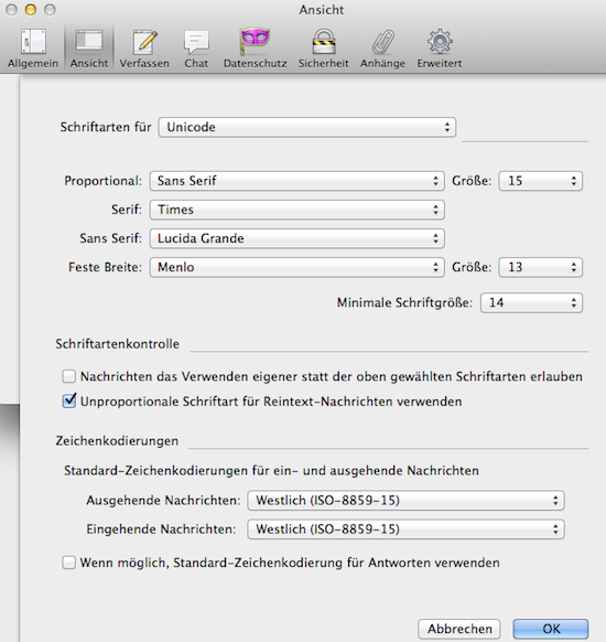 Bei den relevanten Ordnern ist kein Haken im Kästchen Zeichenkodierung auf alle Nachrichten in diesem Ordner anwenden.