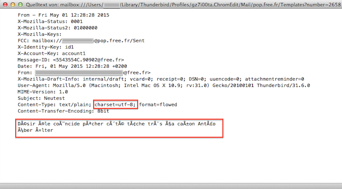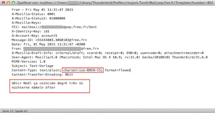 Sowohl in der versandten Vorlage als auch in der auf dem anderen Konto empfangenen Vorlage sind alle gängigen deutschen Umlaute und französischen Akzente korrekt dargestellt.