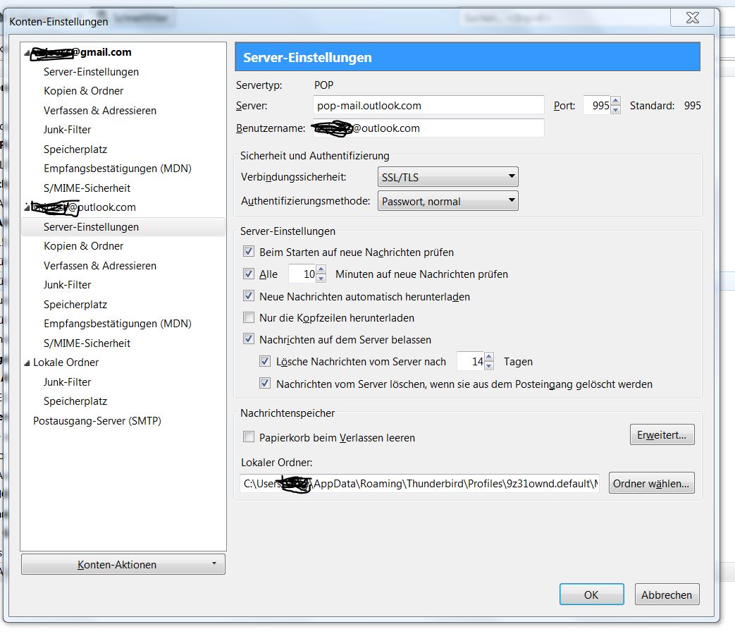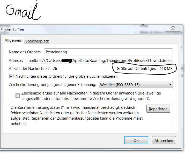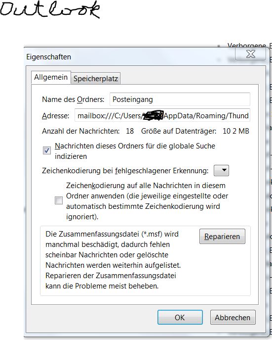 Ferner ruft TB bei Outlook (nicht immer) die E-Mails öfters ab. Über Rechtsklick auf Posteingang - Eigenschaften - Reparieren- erledigt, ohne Erfolg.
