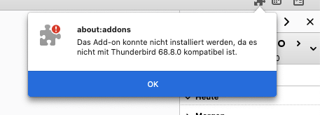 Die Fehlermeldung lautet: Das Add-On konnte nicht installiert werden, da es nicht mit Thunderbird 68.8.0 kompatibel ist.