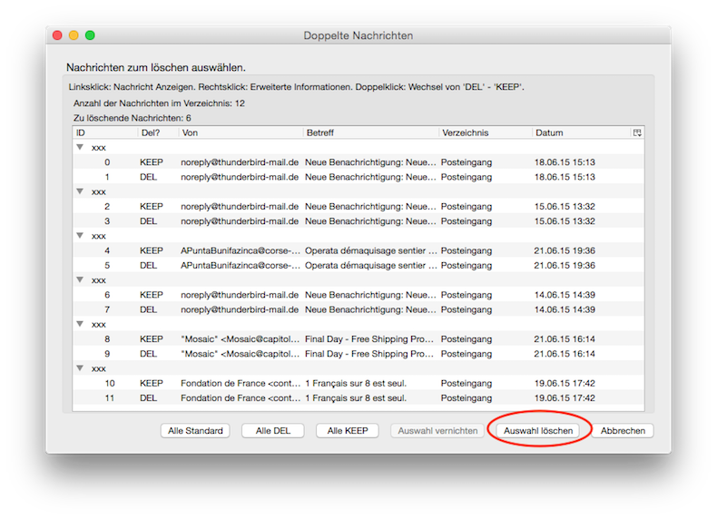 Wenn du auf den Button "Auswahl löschen" klickst, werden alle mit "DEL" gekennzeichneten Duplikate gelöscht (= in den Papierkorb verschoben).