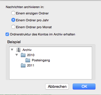 Es sieht so aus, als wenn gesendete und empfangene Nachrichten des jeweils selben Kontos beim Archivieren in einen einzigen Ordner archiviert würden, statt - wie ich gedacht hätte - in jeweils einen für empfangene Nachrichten und für gesendete des jeweils selben Kontos. Läßt sich das umstellen?