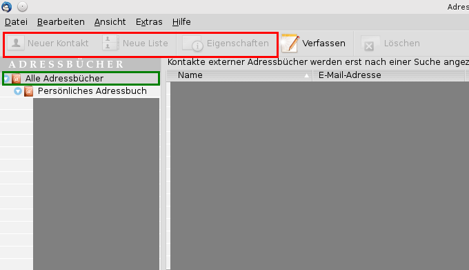 Du musst diesen Cursorbalken erst auf eines Deiner Adressbücher positionieren. Dann sind auch die Schalter [Neuer Kontakt] und [Neue Liste] aktiviert.
