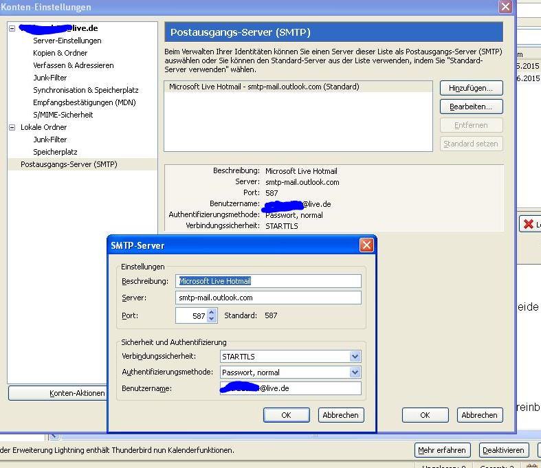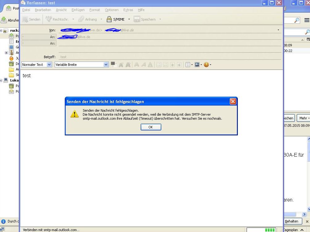 habe seit ungefähr 2 Jahren den Thunderbird in Betrieb, nie hatte ich Probleme damit. Habe plötzlich keine Möglichkeit mehr, eine Email zu versenden(Fehlermeldung siehe Bilder- Timeout) . Vorher ging der Empfang und das Senden, doch nun funktioniert das Senden nicht mehr. Habe mich mit meinem LIVE Account unter live.de angemeldet und getestet und dort funktioniert alles. ( Internet funktioniert, Empfang von Emails funktioniert) Ich habe nochmal das Konto über den Einrichtungs-Assistenten eingerichtet, aber dies hat leider auch nichts gebracht.