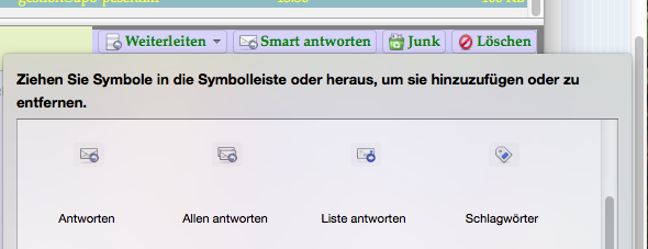 Entferne den Button "Antworten" aus der Symbolleiste und ziehe den Button "Smart Antworten" mit der Maus in die Symbolleiste.