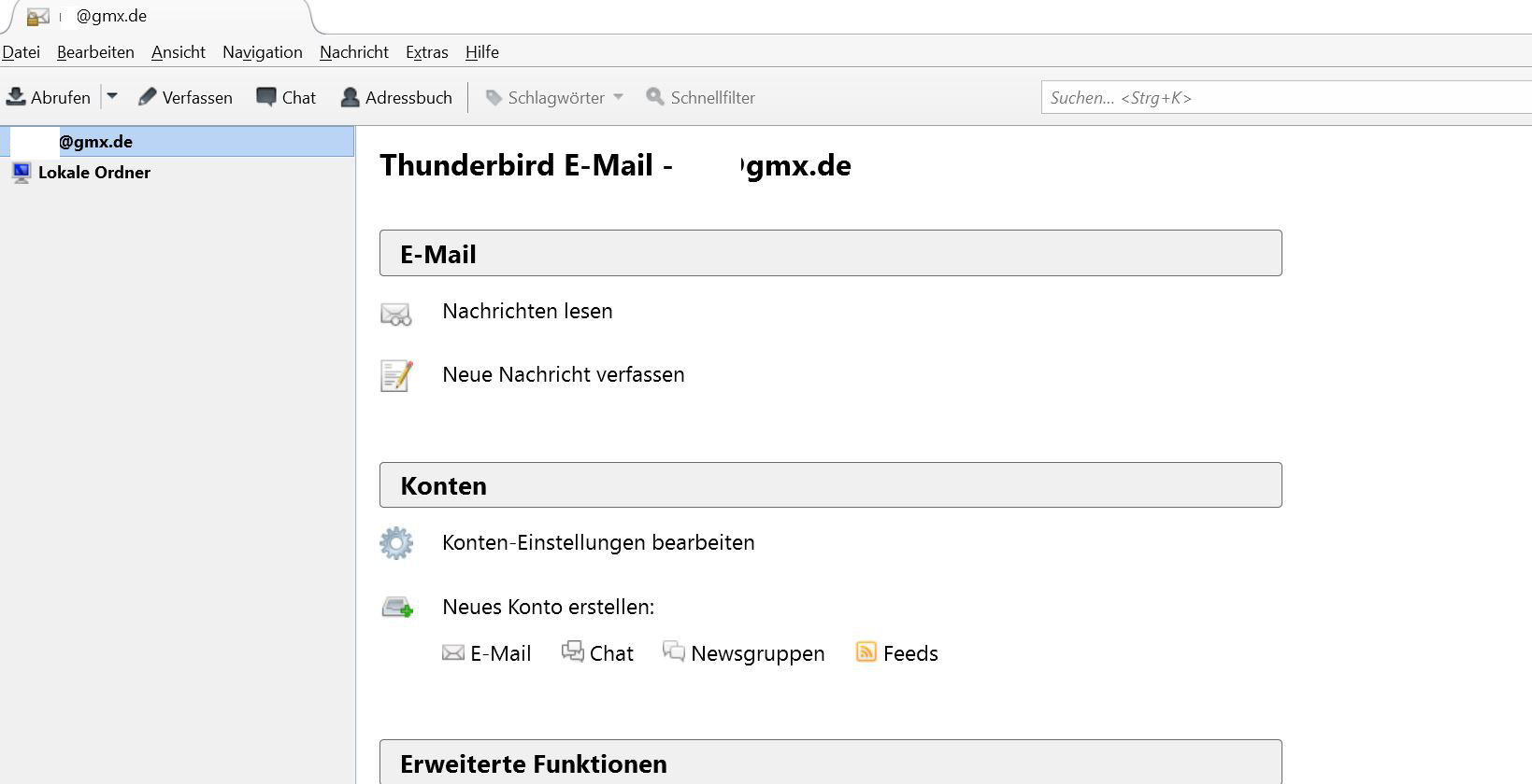 3.) Bei Öffnen von Thunderbird wird mir zwar mein GMX Konto angezeigt, jedoch kann ich keine vorher auf Windows 7 vorhanden Ordner sehen.