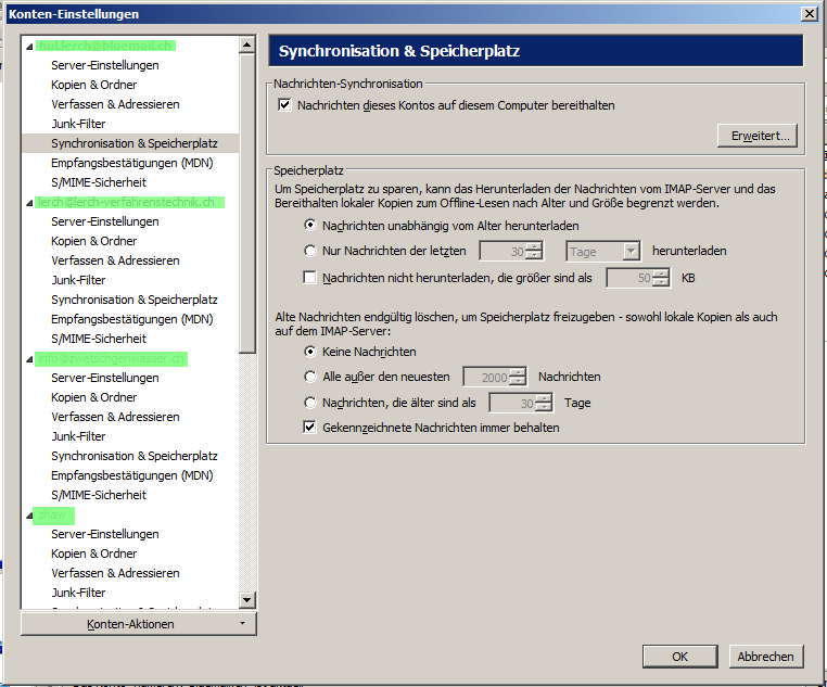 Ich musste mit Schrecken feststellen, dass die lokalen Kopien meiner Mails gelöscht nach vier Monaten werden. Ich habe die untenstehenden Einstellungen gewählt.