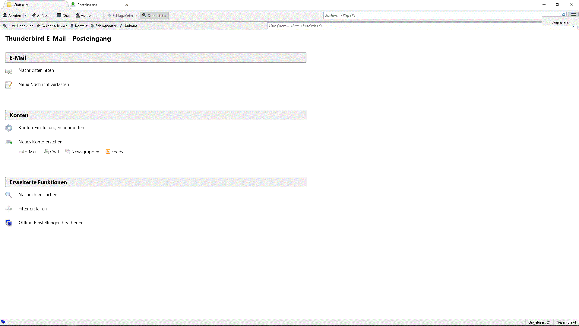 Neuinstallation von Thunderbird brachten keine Änderung. Auch die Versionsanzeige und Updateabfrage unter "Hilfe" reagieren nicht.